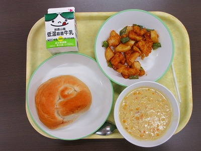 米粉パン、牛乳、いかと野菜のレモン風味揚げ、コーンチャウダーでした。