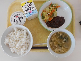 米飯、牛乳、豆腐と野菜の肉みそかけ、地物たっぷりかきたま汁でした。