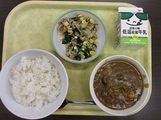 米飯、牛乳、夏野菜チキンカレー、チーズ入り海そうサラダでした。