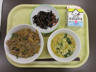 三重豚丼、牛乳、あらめの煮物、かきたま汁でした。
