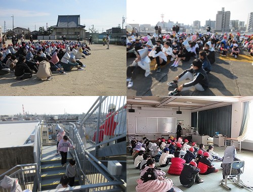 20分休みだったので、子どもたちは運動場や教室、廊下、階段など、いろいろなところで訓練用の緊急地震速報を聞きました。今回は放送での指示をしませんでしたので、近くにいる先生の指示を聞き、周りの様子を確かめながら一次避難で運動場に集合しました。その後、津波を想定して校舎の屋上に二次避難しました。予断を許さない状況を想定し、三次避難として校舎3階の各教室に1~6年生が分かれました。非常食を配るところまではしませんでしたが、この3月卒業する6年生には年度末にご家庭へ持たせたいと考えています。