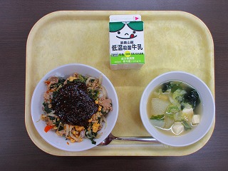 ビビンバは、子どもも大人も人気メニューです。おいしさの秘訣は、野菜(にんじん・ほうれん草・もやし)、豚肉、卵とおいしいみそ味に、にんにくやショウガが効いているからだと思います。今日も大変美味しかったです。