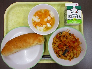 小型玄米パン、牛乳、夏野菜のトマトスパゲッティ、杏仁フルーツでした。