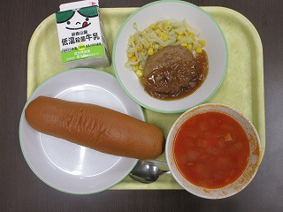 黒糖パン、牛乳、照り焼きハンバーグ、コーンソテー、ミネストローネでした。