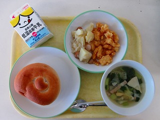 米粉パン、牛乳、いかのカレーあげ、リヨネーズポテト、野菜スープでした。