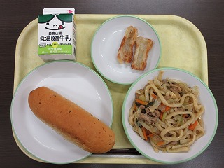 小型玄米パン、牛乳、焼きうどん、ちくわの天ぷらでした。