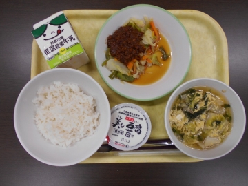 米飯、牛乳、豆腐と野菜の肉みそがけ、かきたま汁でした。