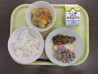 米飯、牛乳、いわしのピリ辛煮、ゆかりあえ、肉じゃがでした。