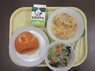 米粉パン、牛乳、豆乳グラタン、キャベツのスープでした。