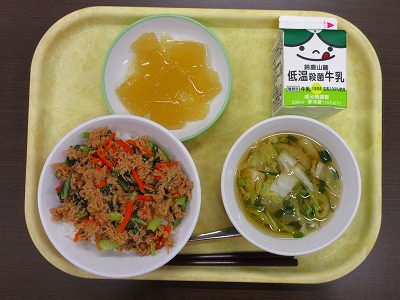 ツナ丼、牛乳、すまし汁、手作りりんごゼリーでした。