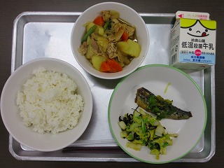 米飯、牛乳、いわしのピリ辛煮、こんぶあえ、肉じゃがでした。