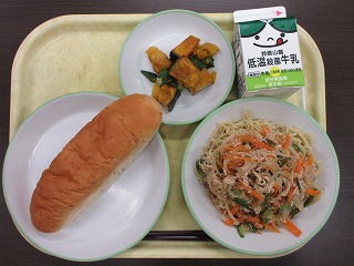 小型玄米パン、牛乳、冷やし中華、フライドベジタブルでした。