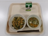 4/15(月)は、牛乳・けんちん汁・さけの三色丼でした。鮭のそぼろが細かくて美味しくて、子どもたちに人気でした。