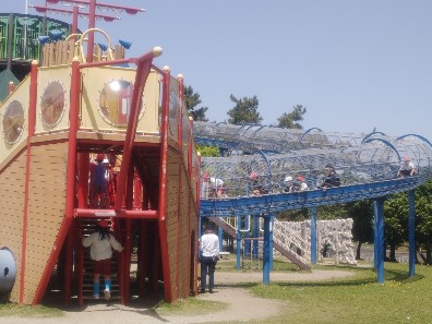 貸し切り状態のコンビネーション遊具で、存分に遊びます。
