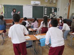 ★入学して間もない1年生ですが、音楽の授業では元気いっぱいの歌声が響いていました。校歌が流れると歌いだす子どもたち。下校の際にも歌いながら帰っていく様子が見られるくらいどの子も校歌が大好きです。その後、「セブンステップ」の曲が流れると・・・隣の子と手をたたきながら、自分なりの表現を思いきり楽しんでいました。