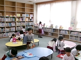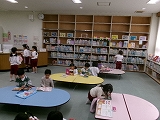 図書室で読書。お気に入りの絵本を手に取り、自分で読んだり友だちと読んだり‥