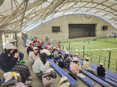 ドームのベンチに腰掛けて、お弁当タイムです。