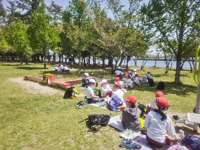 青い海が見えて、青い空のもと、お弁当タイムです。