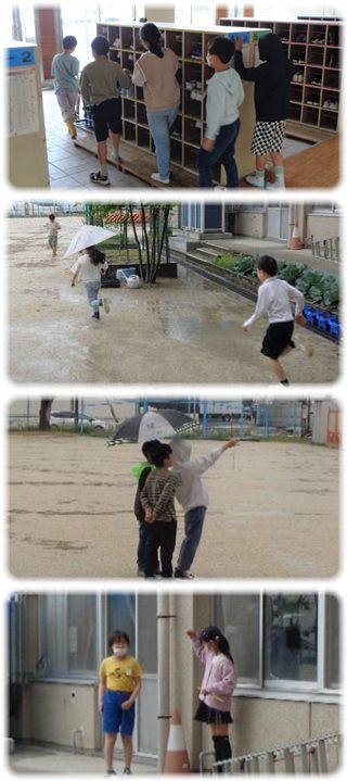 その動きを追いかけると、ある子は傘をさして、ある子は傘も差さずに運動場へ出ていきます。