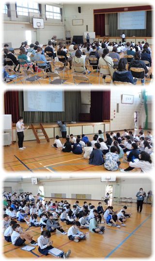 5年生とその保護者の皆さんが体育館に集まって、