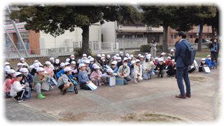 浜田公園に集まった子どもたちは、学級ごとに2列に並んで座り、教師から話を聴きました。