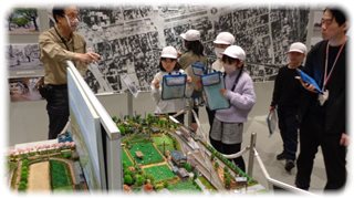 子どもたちは、人、建物、電車、自動車などなど、町の風景が生き生きと立体的に作られているのにびっくり。