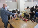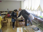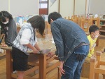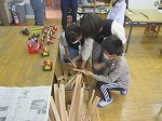 この取組は、今年で3年目なので、このGSの方々の声を参考に、木の素材、大きさ、ノコギリの使い方(今回は子ども用の小さいのこぎりも用意してくれました。)ボンド(速攻接着)など、子どもたちがより作業しやすいように考えていただいていました。