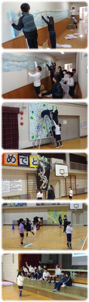 体育館への通路の壁面の飾りつけを担当する子どもたちは、背景となる不織布を少しでも高いところに飾りたい、という思いから、この時間、授業のない教師を巻き込んで不織布を張っていました。