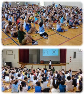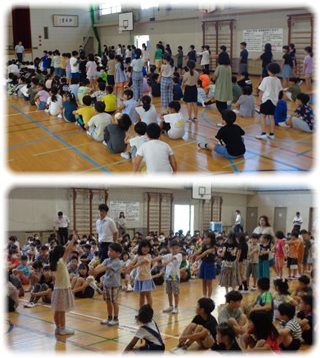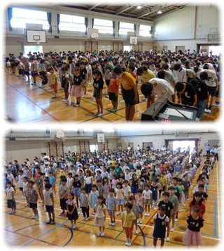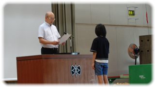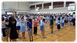 校長の話では、一人ひとりがこの1学期に“できた”“のびた”ことを振り返った後、私が見た各学年のがんばっていたことを簡単に話し、6年生は、友だちの“よさ”を自分の中に取り入れたり、全体に広げたりして、仲間とともに自分を成長させていたことを事例を交えて紹介しました。