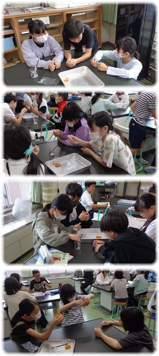 理科でヒトや動物の体について学習している6年生が理科室で実験をしていました。