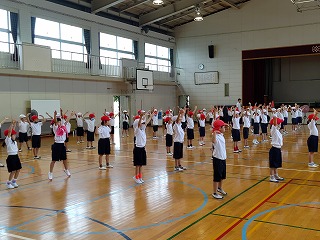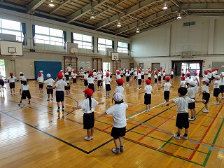 今日も天候が悪くて、1年生は体育館で運動会の練習をしました。今日はラジオ体操第1の練習です。何となくやった経験はありましたが、一つ一つ動く方向や動かし出す手や足の左右を確認していると、汗が出てきます。準備体操も運動会の種目と思って、一生懸命覚えています。