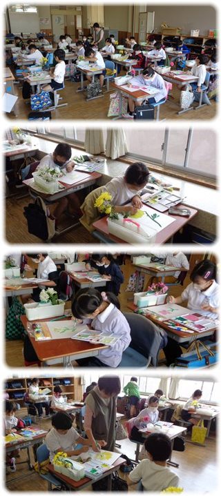 子どもたちはその花をよーく見て、画用紙に描いていました。