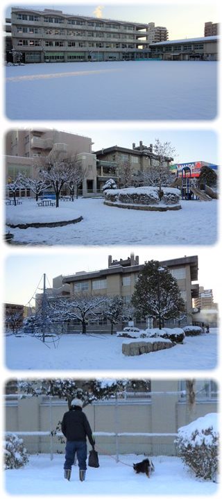 学校の隣の浜田公園は、樹木の枝葉や植栽に雪がのり、雪化粧した庭園のようでした。