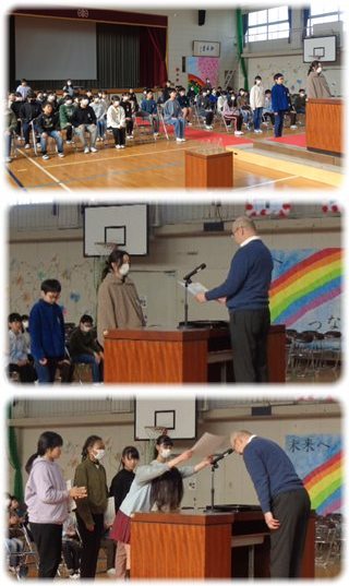 書写展覧会の2人、美術展覧会の5人は、体育館中央の演題に上がり、“卒業証書授与”で覚えた作法に則って表彰状を受け取っていきました。