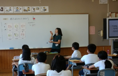 英語の授業が再開しましたが、マスクをしていると口元を見せての指導ができません。フェースシールドをつけての授業です。