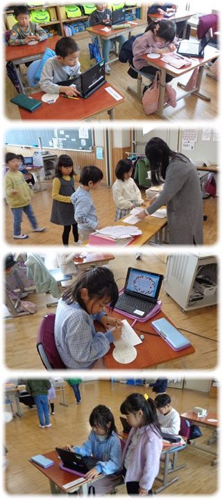 子どもたちの机の上には、タブレットと円の形の白い画用紙。