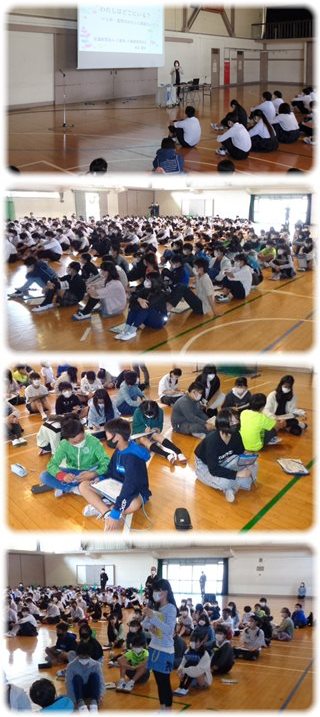 6年生が港中学校の体育館で、港中生徒の皆さんと合同の人権学習会に参加し、「反差別・人権研究所みえ」に勤める研究員による講演を聞きました。