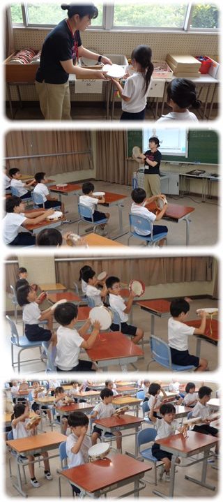教師から1つずつタンブリンを受け取って、演奏しました。