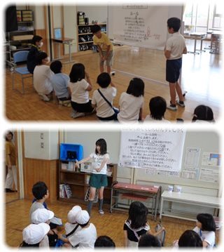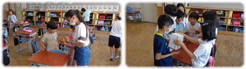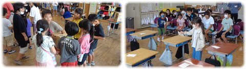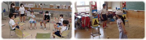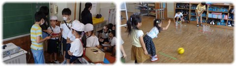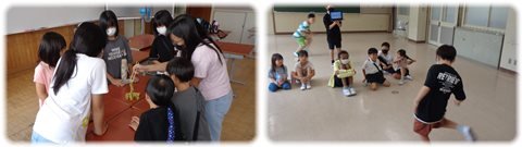 左:物あてゲーム 代表の子が箱の中に入っているものを触ってその特徴を話し、それを聞いた班の子が入っているものを当てるゲーム。