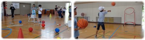 右:フリースロー バスケットボールをゴールめがけてシュート。高学年はバスケットゴールへ。低学年は、低くて大きい口のゴールへ。