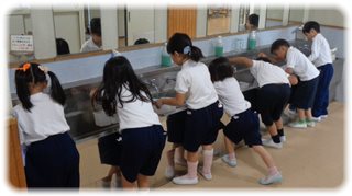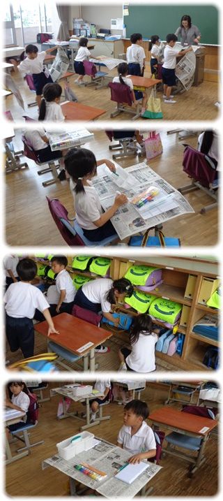 新聞を受け取って机に広げた子どもたちは、“えのぐ”“ふで”“ぱれっと”“ぞうきん(すぽんじ)”“みずいれ”を順番にかばんから出して机の上へ。