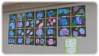 後ろの掲示板には、子どもたちのつくった満開のアジサイが咲き、梅雨の教室を彩っていました。
