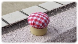 こうしてできた“てるてる坊主”を、ペットボルトのキャップに押し入れたら、“針刺し”の完成です。