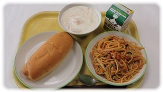 メニュー…大豆入りスパゲッティミートソース、フルーツヨーグルト、小型玄米パン、牛乳