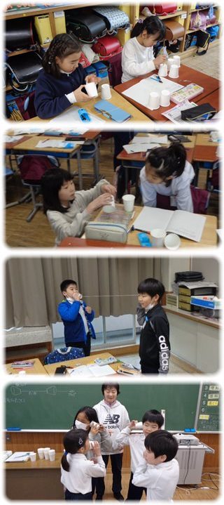 2つの糸電話の糸を絡めて、1人が話す声を3人が同時に聞こうとする班や、教師におねだりしてもらった長ーーーーいタコ糸をつけた糸電話で試す班もありました。