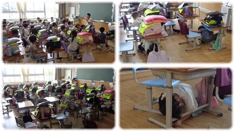 1年の子どもたちは、スピーカーから流れる放送にじっと耳を傾け、教師の指示で机の下に身を隠しました。