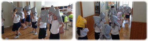 減災頭巾を被って2列に整列し、教室を出たら左へ。