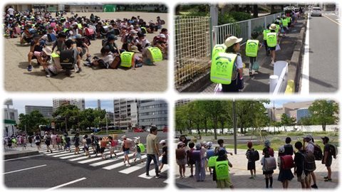 黄色い旗を手に子どもたちの通行と横断を助けてくれたのは、毎朝子どもたちの登校を見守ってくれる、浜田っ子応援団長さんと主任児童委員さんです。