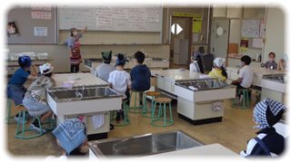 調理前の準備、調理中に気をつけること、用具・器具の用意などを教師から聞いた子どもたちは、材料は前のテーブルに、ざるや器などは準備室に、班で手分けをして取りに行って必要なものをそろえました。