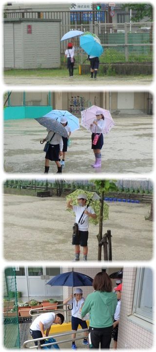 なのに、体操服の子どもたちが、傘をさして運動場に出てきました。